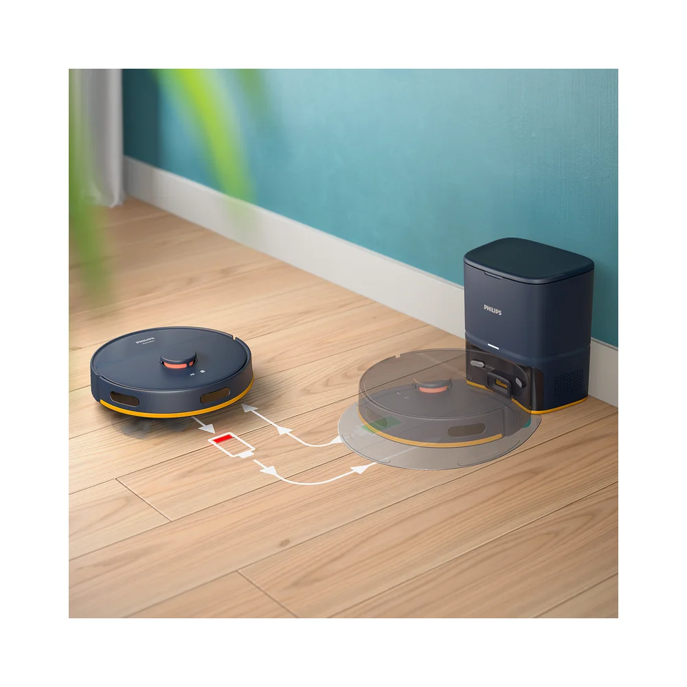 Iskusite neprekinuto čišćenje uz 130 minuta* rada baterije, što je dovoljno za do 120 m² na jednom punjenju. Kad se baterija isprazni, robot će se automatski vratiti na stanicu kako bi se napunio. Nakon što se baterija napuni, vratit će se na mjesto gdje se zaustavio kako bi nastavio čišćenje.