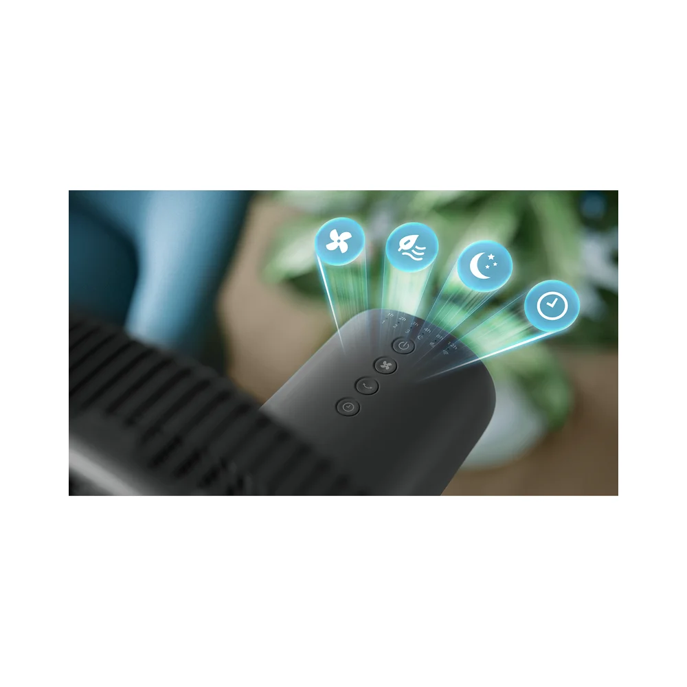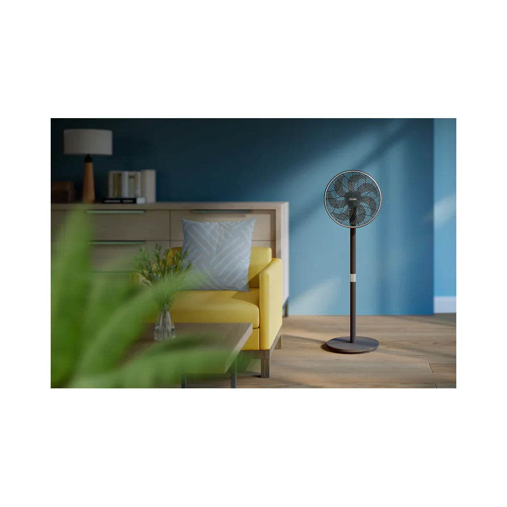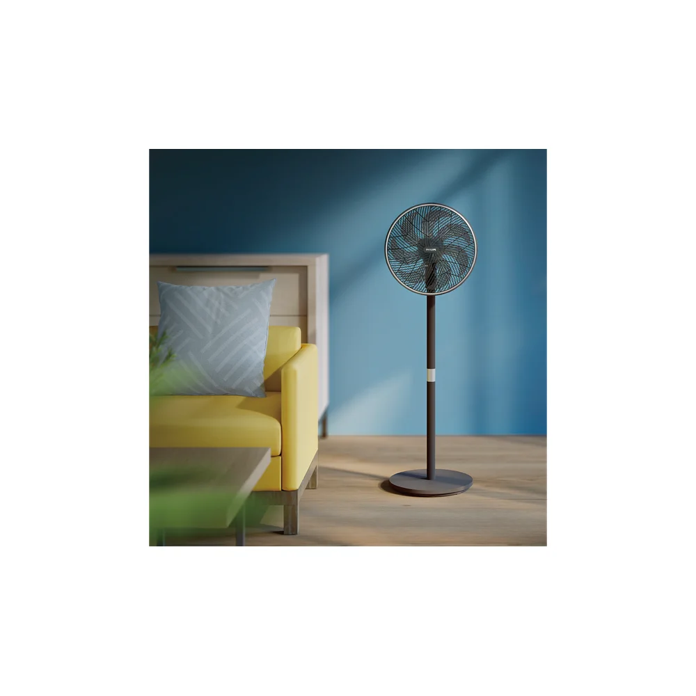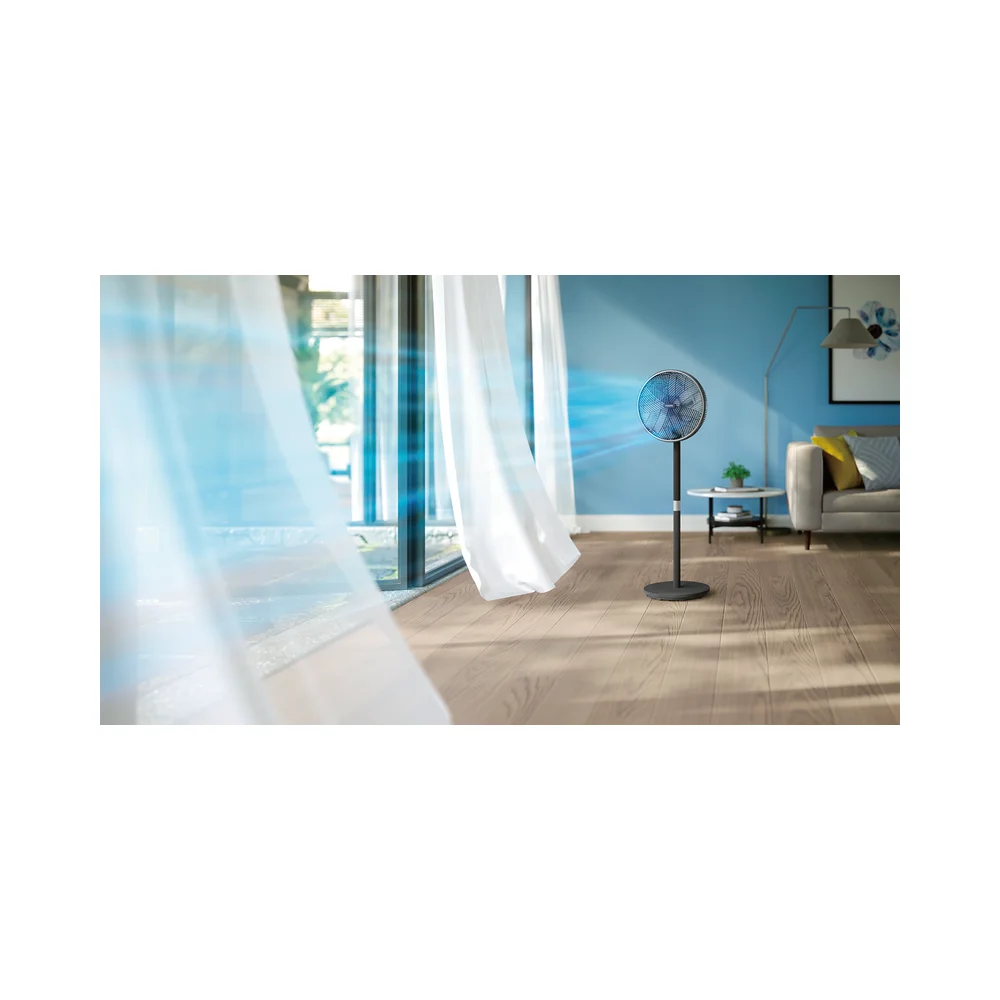 Maksimalna snaga rashlađivanja, minimalna razina buke. Ovaj ventilator s postoljem osmišljen je u dizajnu koji upotpunjuje interijer svakog doma i hladi velike sobe snažnim, iznimno tihim protokom zraka. Prilagodite svoje iskustvo uz 3 brzine, 2 načina rada i mjerač vremena te njime upravljajte s udaljene lokacije putem aplikacije.